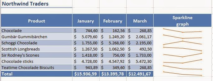 Sparkline grafikoni nam omogočajo vnos in prikaz grafikonov v sami celici ali v skupini združenih celic. Na voljo imamo 3 tipe sparkline grafikonov: črtni, stolpčni in dobiček/izguba.