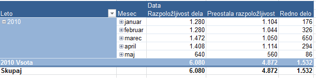 V prvem stolpcu (Razpoložljivost dela) prikazujemo celotno razpoložljivost skupine virov, razpoložljivost v mesecih od januarja do maja, se giblje od 1.280 ur do 640 ur v mesecu maju. To so ure, ki predstavljajo razpoložljivost virov izbrani skupini virov. V tretjem stolpcu (Redno delo) prikazujemo že dodeljeno delo celotni skupini virov. V drugem stolpcu (Preostala razpoložljivost) prikazujemo število ur, oziroma za koliko ur še lahko obremenimo celotno skupino virov. Vsota drugega in tretjega stolpca mora